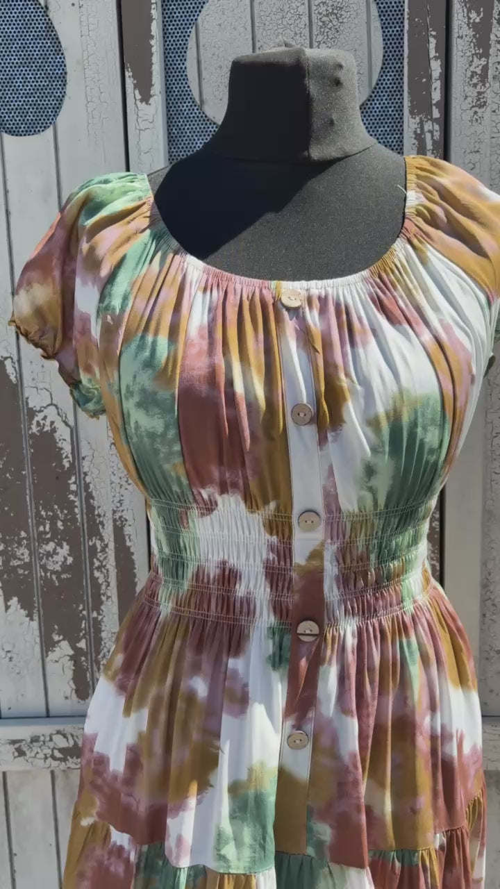 A charming row of faux wooden buttons adds rustic charm to the front of the dress – a subtle, stylish nod to nature-inspired design. -