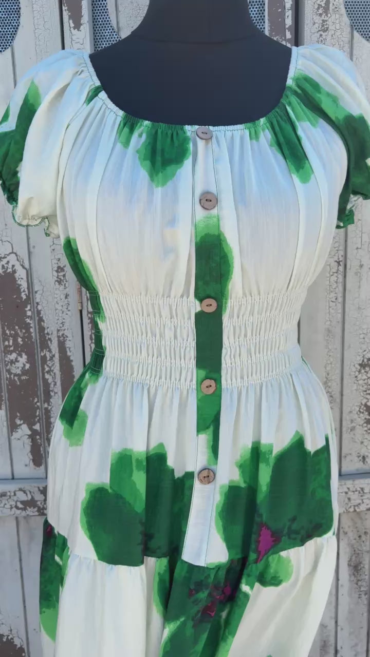 Designed with a stretchy, elasticated neckline, this Bardot dress can be worn on or off the shoulder, giving you the flexibility to style it your way — from beach days to garden parties. The short elasticated sleeves add a gentle ruffle that enhances its boho-chic appeal.